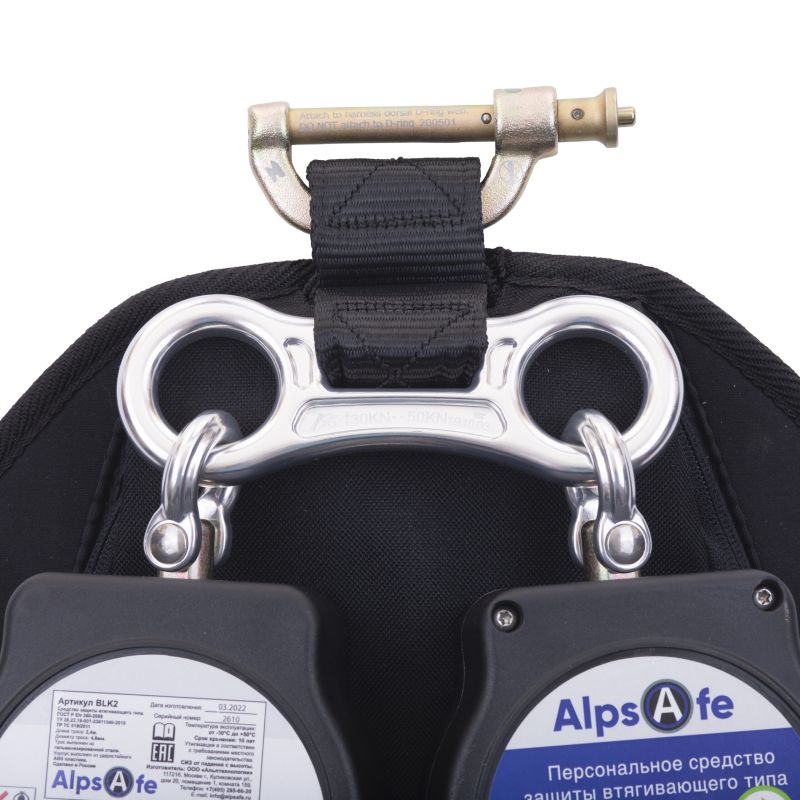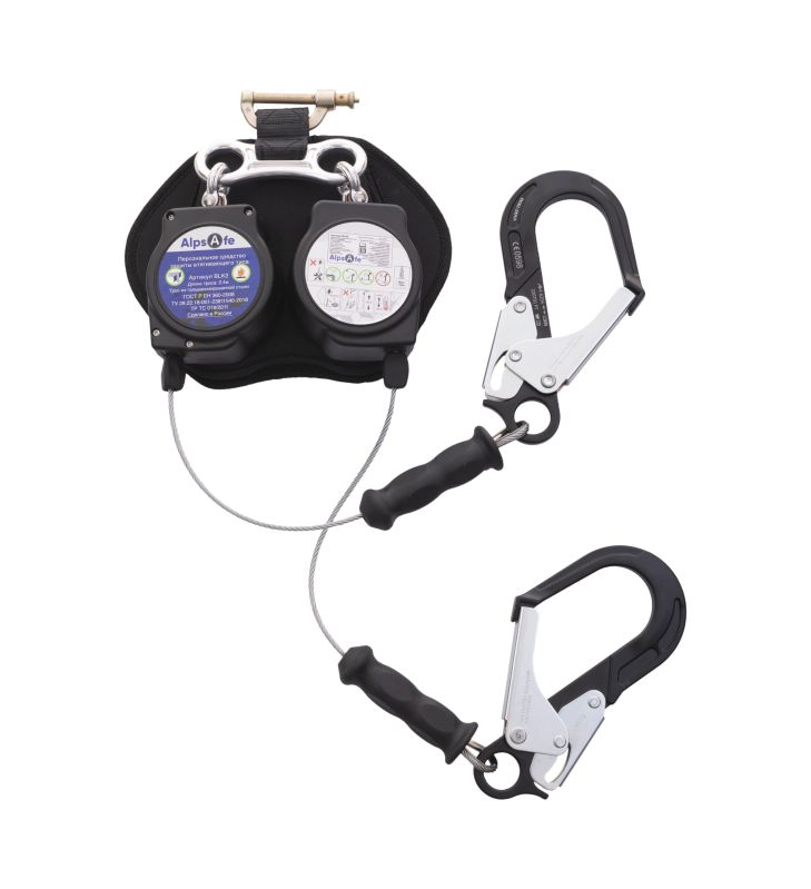 Средство индивидуальной защиты от падения с высоты втягивающего типа (блокирующее устройство) двуплечевое с функцией самоблокировки и автоматическим средством натяжения и возврата втягивающегося троса. Представляет собой соединительно-амортизирующую подсистему и применяется для соединения страховочной привязи с анкерной точкой.
