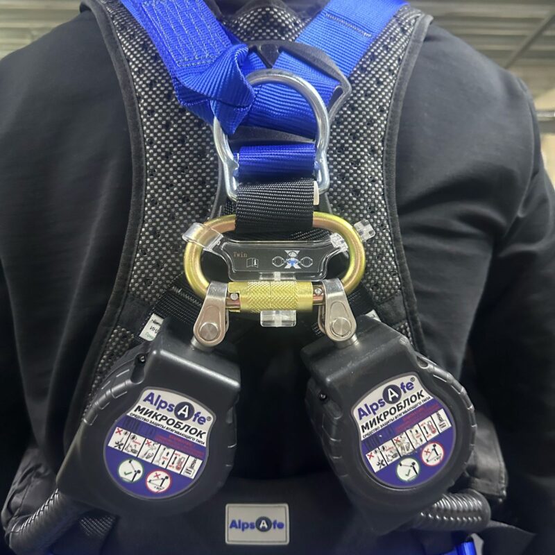 Средство индивидуальной защиты от падения с высоты втягивающего типа (блокирующее устройство) с функцией самоблокировки и автоматическим средством натяжения и возврата втягивающегося троса. Представляет собой соединительно-амортизирующую подсистему и применяется для соединения страховочной привязи с анкерной точкой.